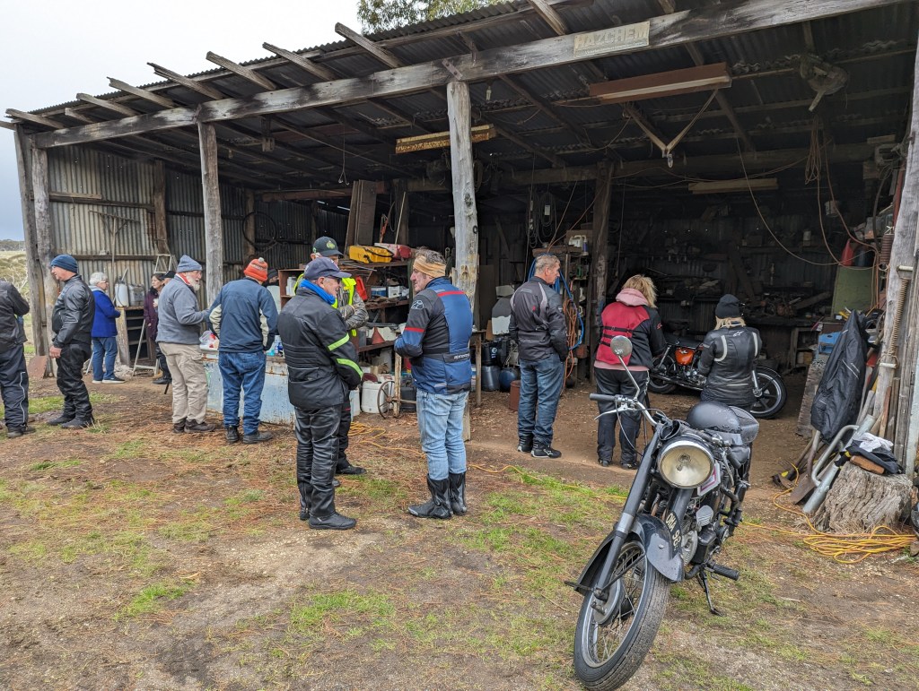 Thanks to the group of hardy riders that braved the elements today and ventured out through the picturesque countryside to “Jack’s Shed” where they gathered around the fire, the urn & BBQ to defrost and dried out enough to get photos of there pride and joy in this unique backdrop.