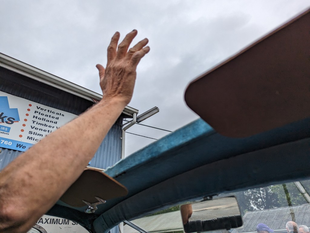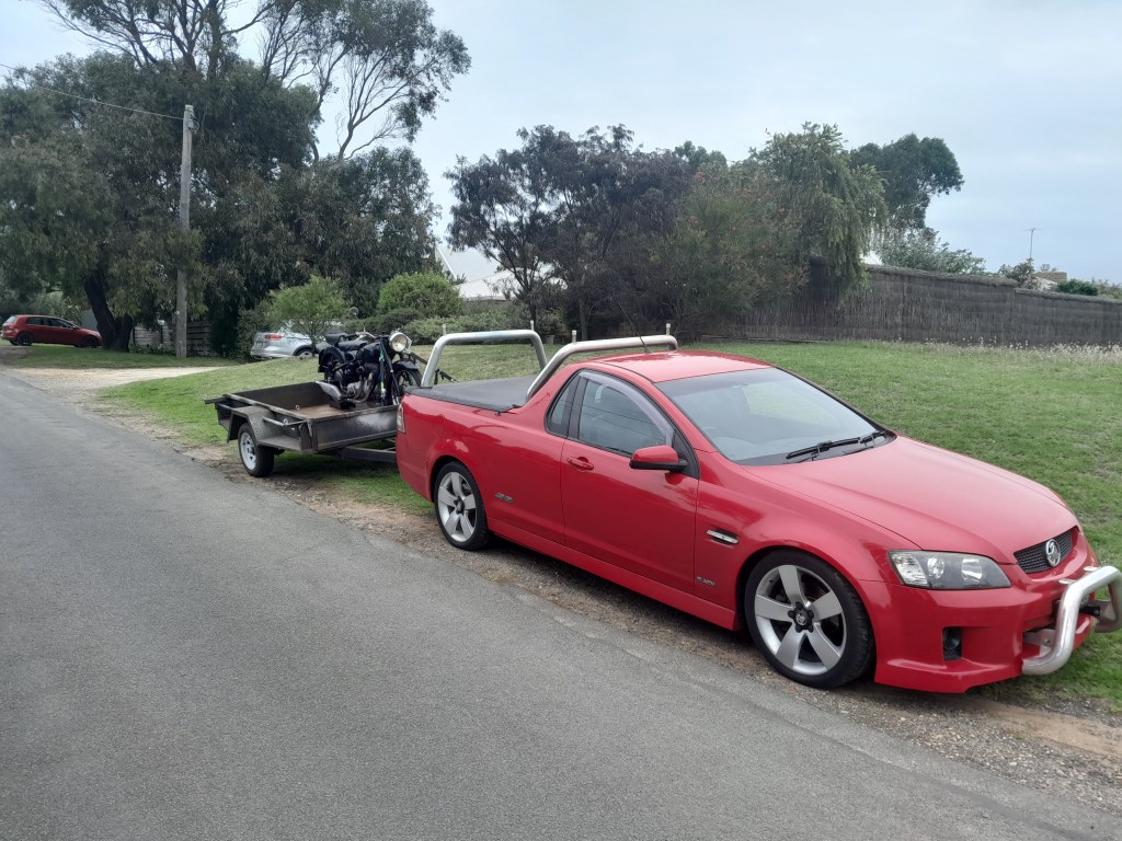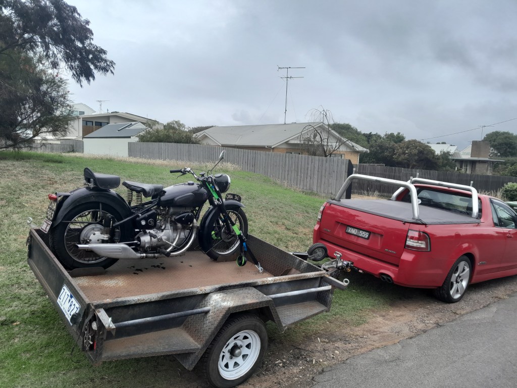 Pat and the Sunbeam enjoyed a leisurely trip back into town compliments of Ross Bell & his SS Ute & Trailer, thanks Ross.