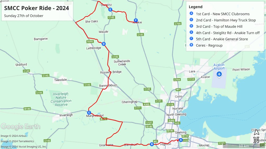 Approx 80km from the Clubrooms to the Anakie General Store (collecting cards at various stops along the route , then 30km back into Geelong.