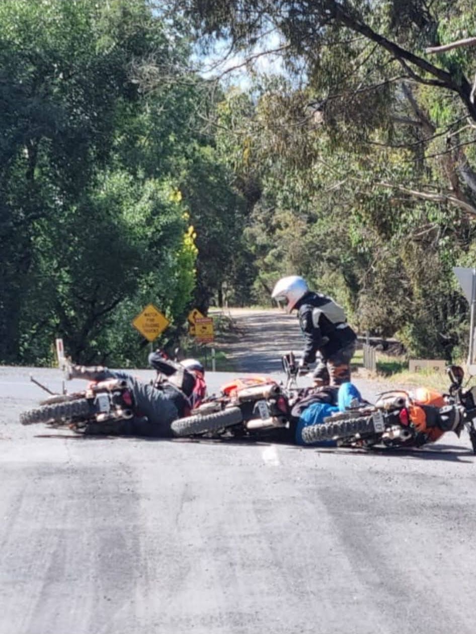 Beak was enjoying a leisurely ride near Deans Marsh with mates when allegedly Deano pulled up and had an “issue” with his stand bringing on the Domino’s effect.
