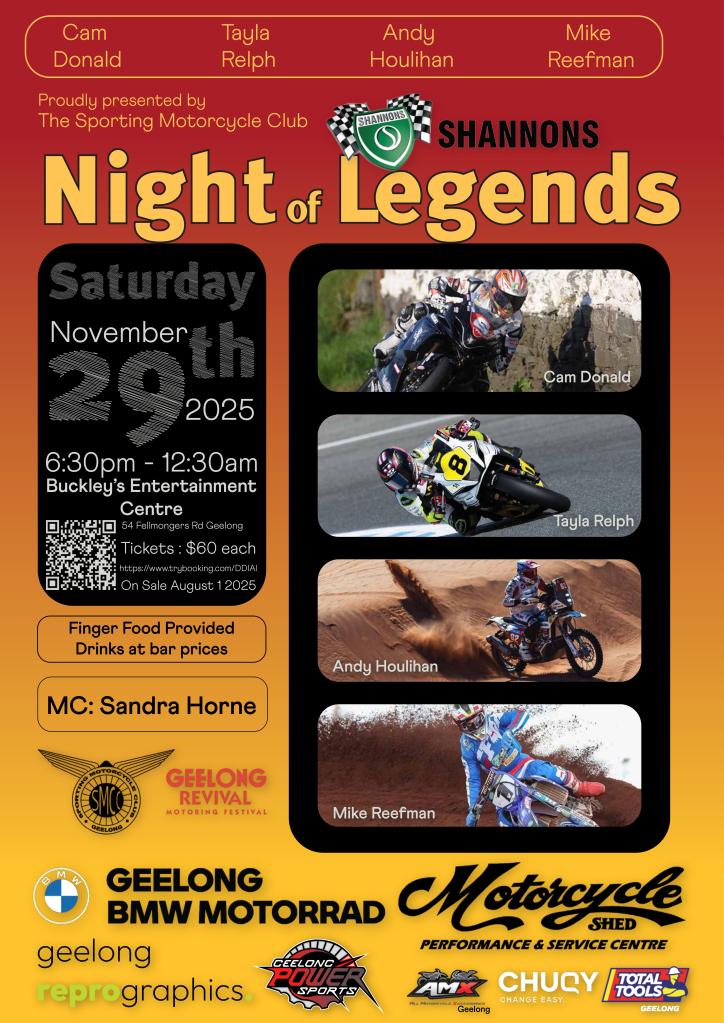The Sporting Motorcycle Club is proud to present the 2025 Shannons Night of Legends – a celebration of motorcycling greatness featuring some of Australia’s finest riders:
