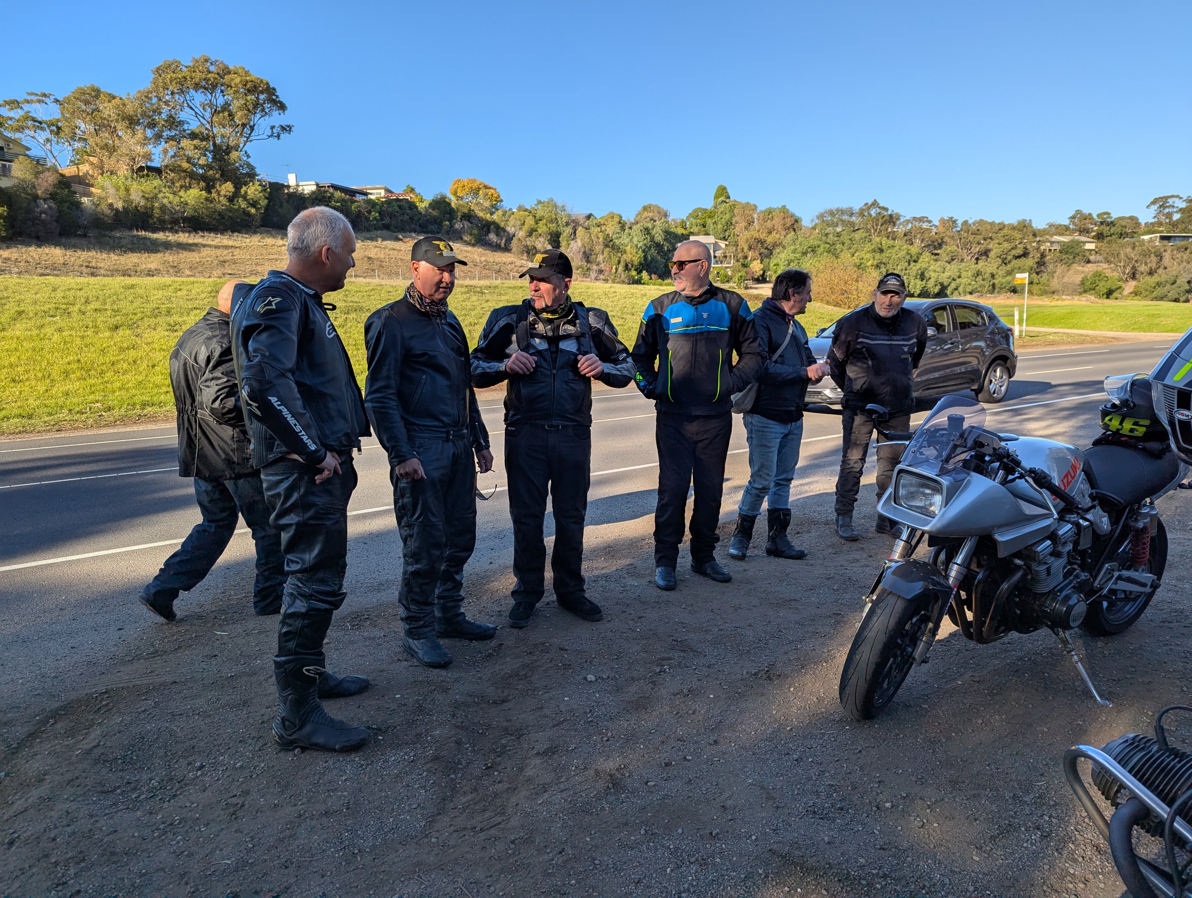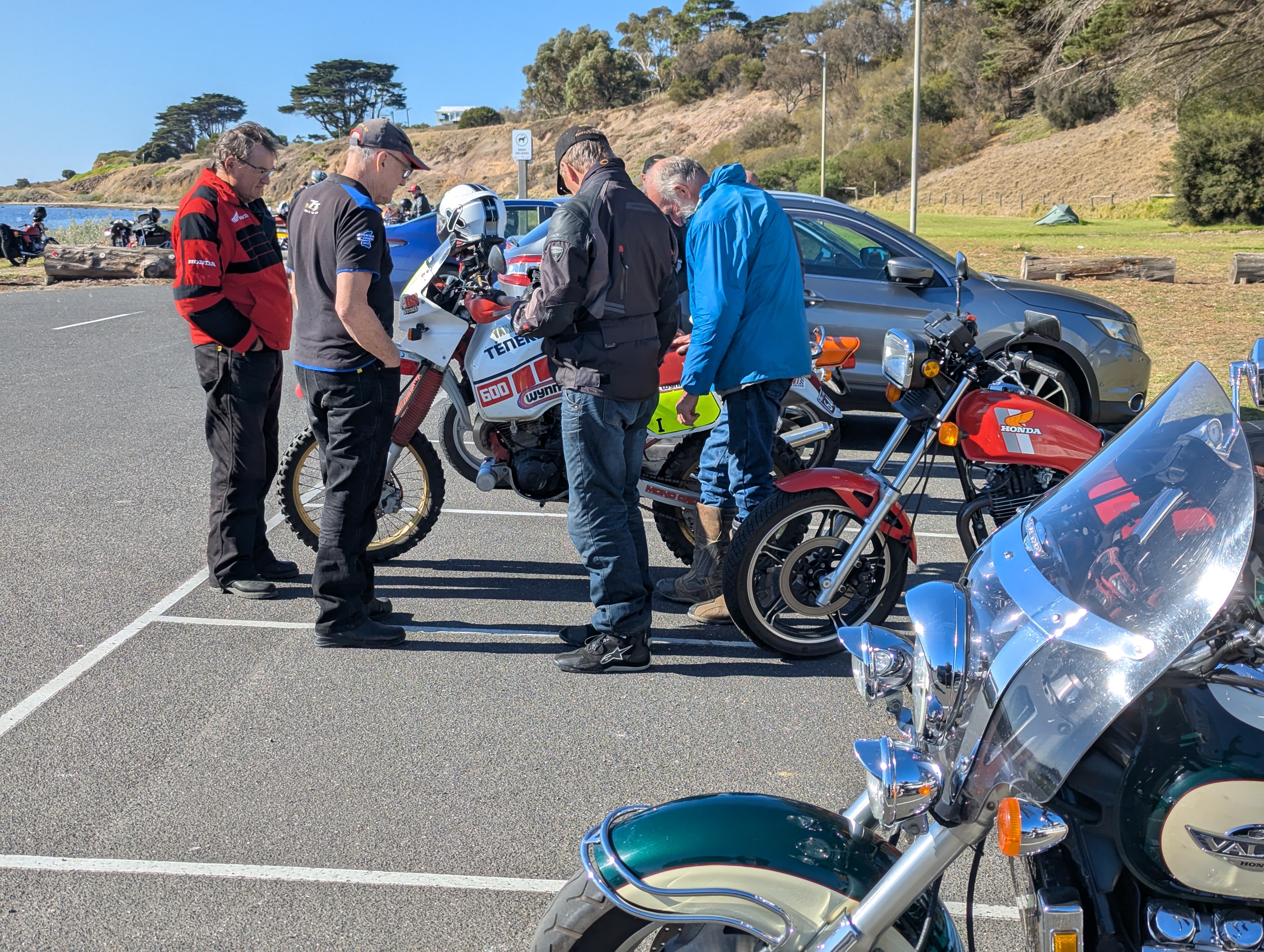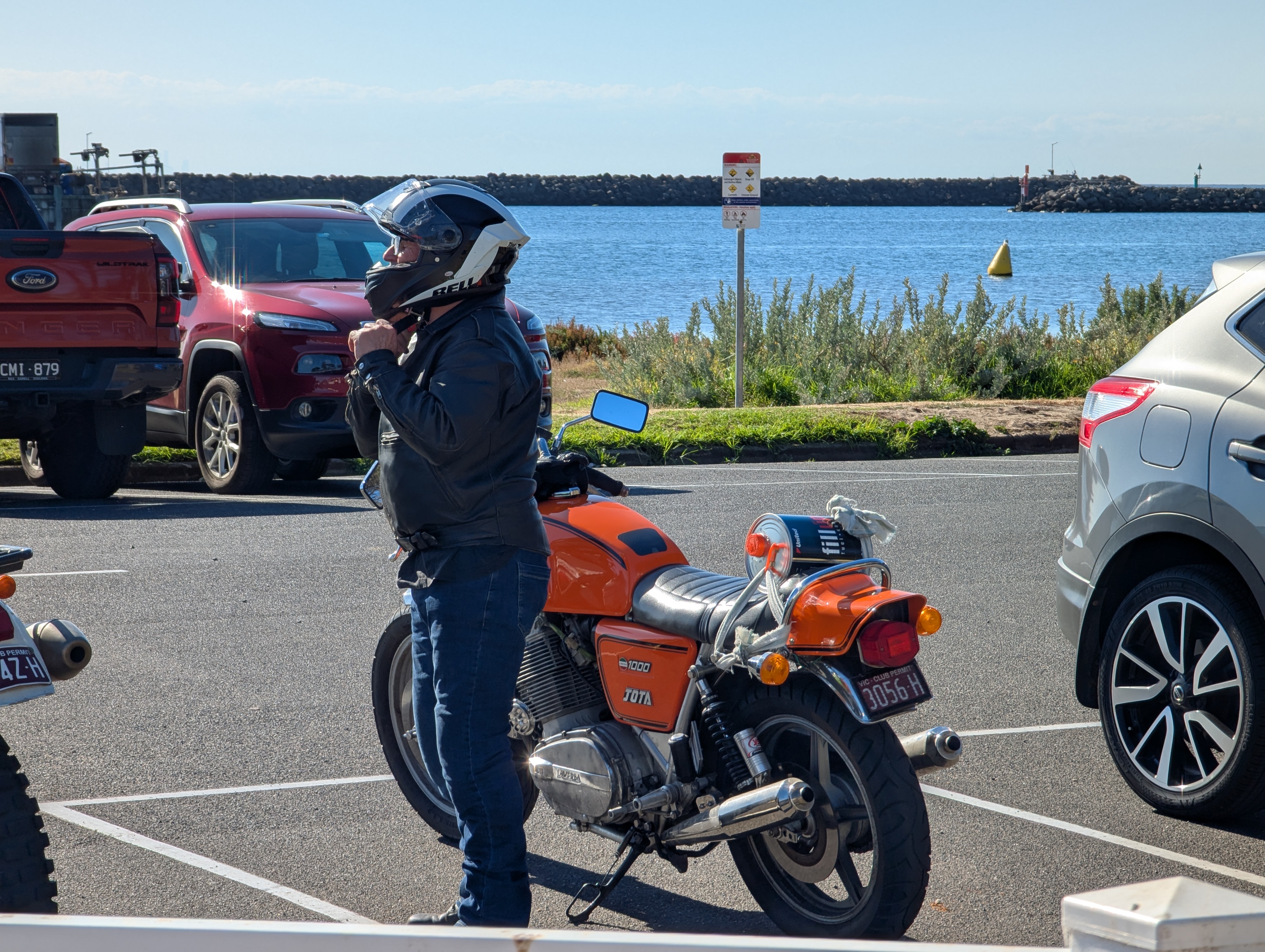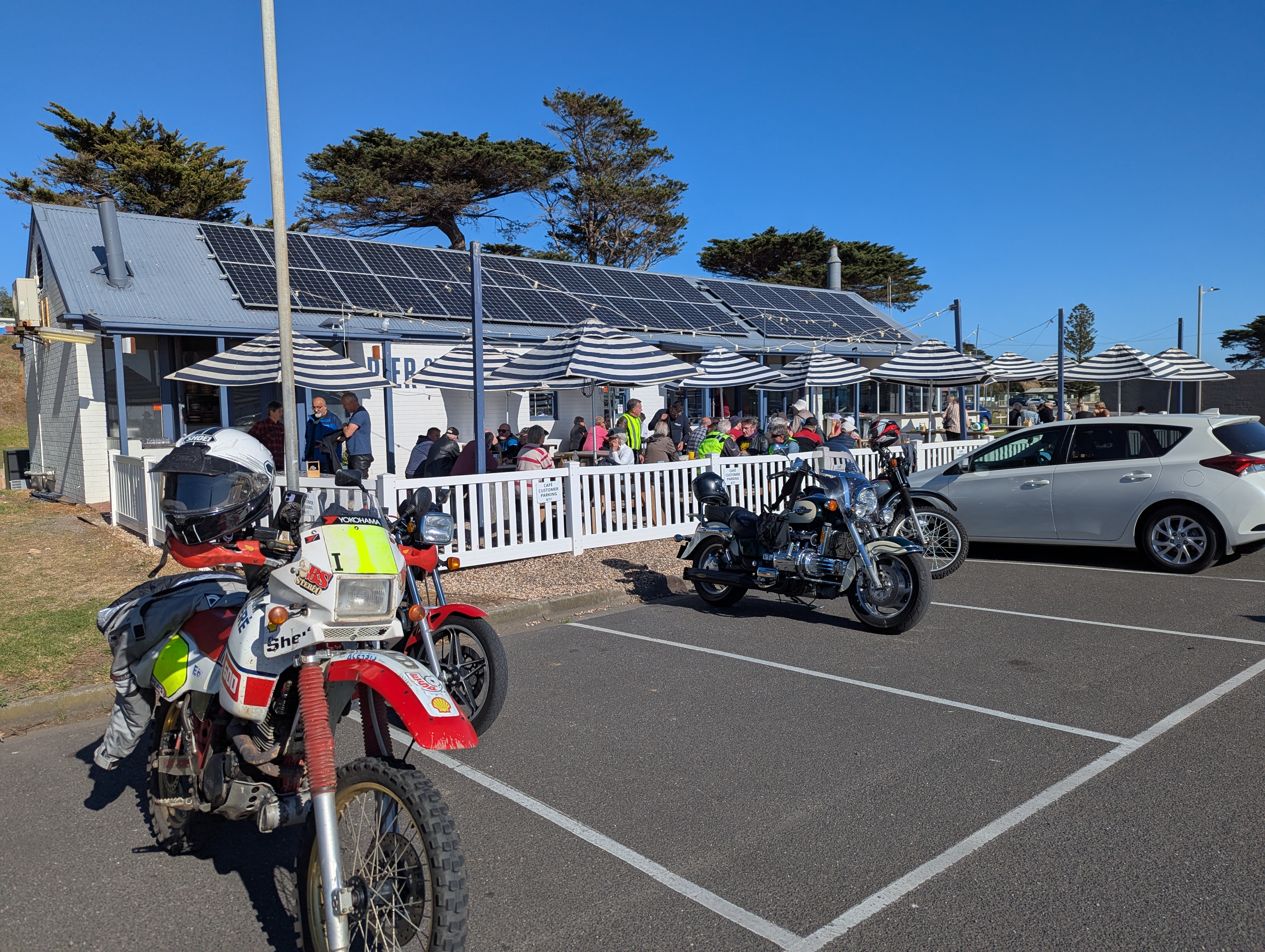 With a few events of note, Ross Bell’s Laverda running on only 2 cylinders requiring Ross to open up the big dellorto carbies to maintain a cruising speed, but a side effect that the hungry Laverda chewed through 15L to do only 80km and leaving Ross out of fuel within site of the Pier St cafe, with assistance from a fellow member Ross was soon arriving at the cafe along with a 5L Jerry Can strapped to the pillion seat.