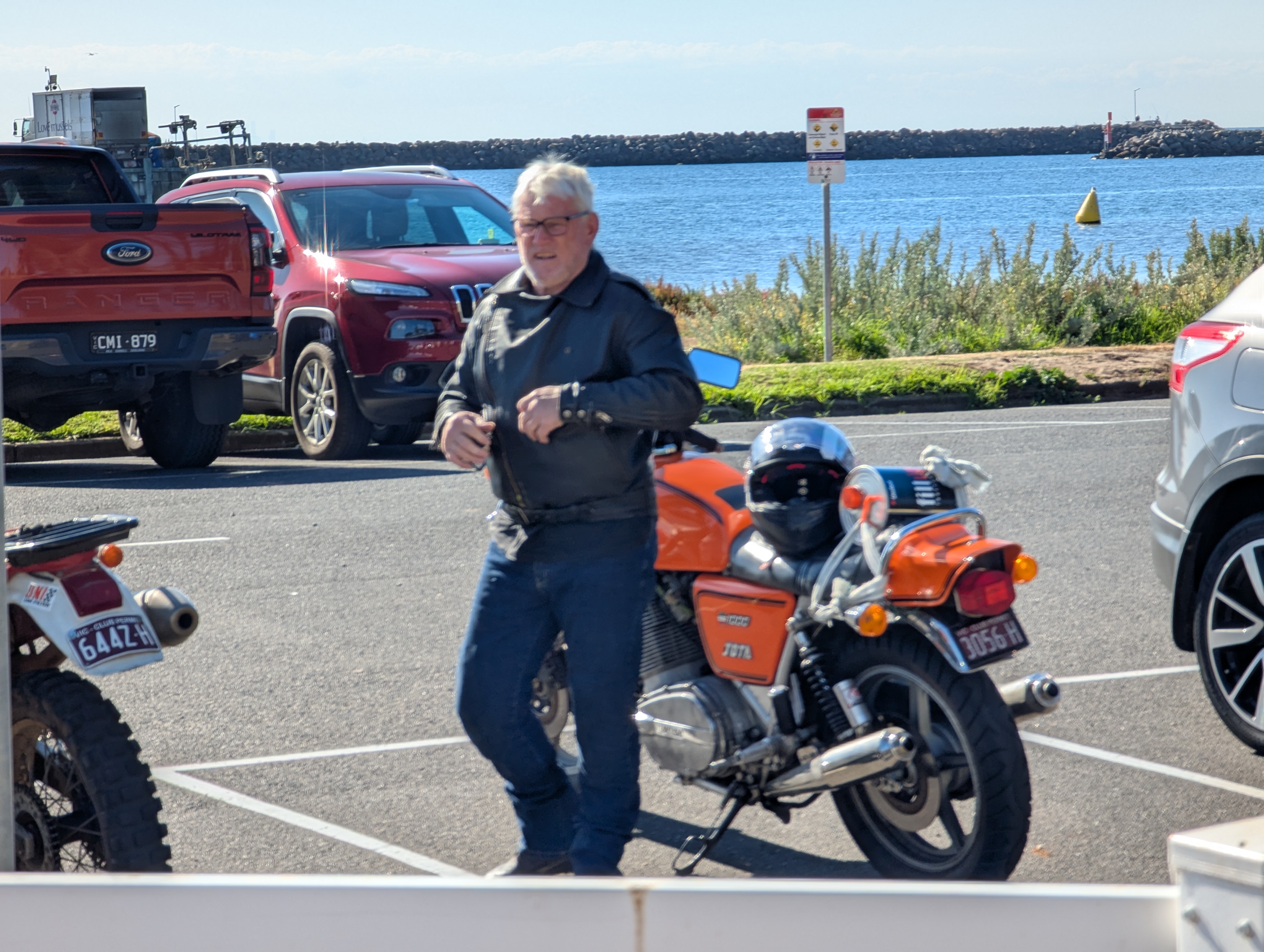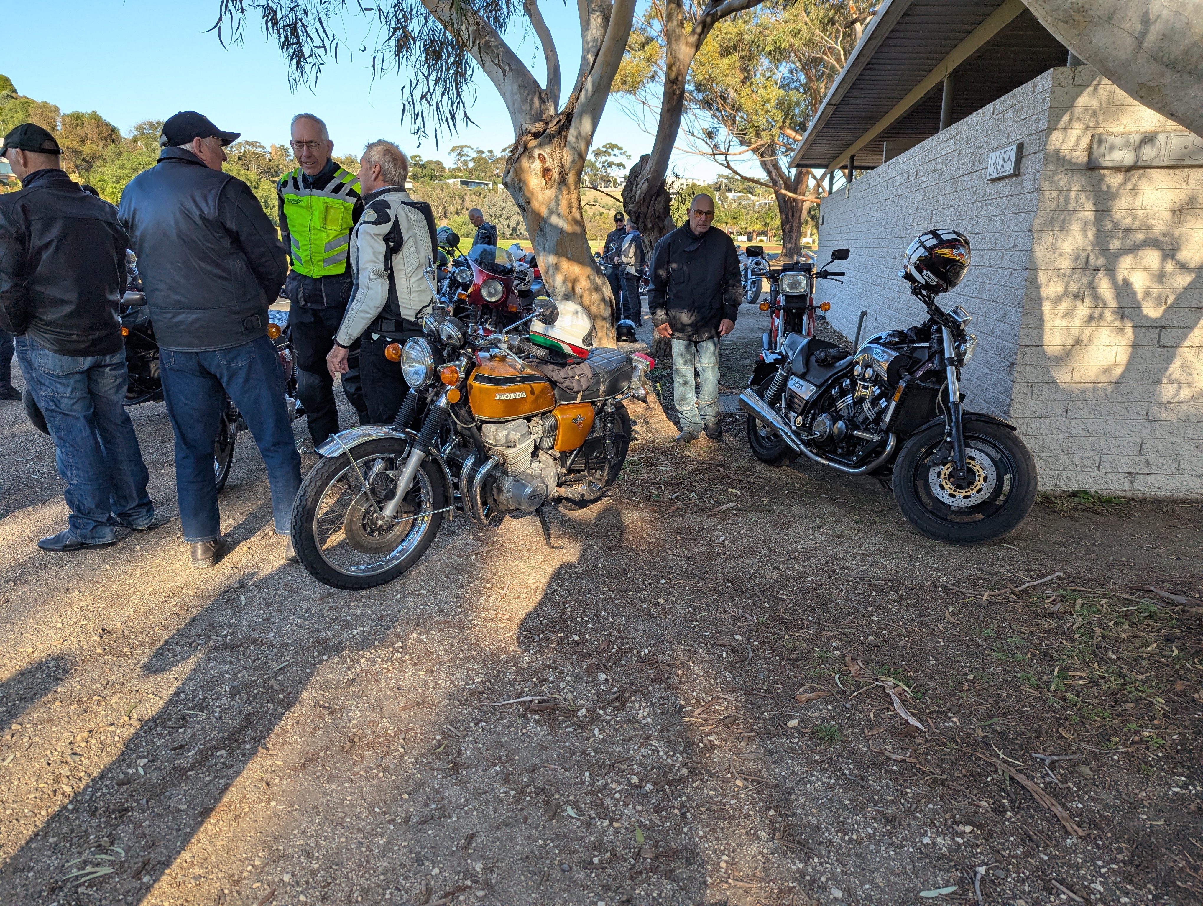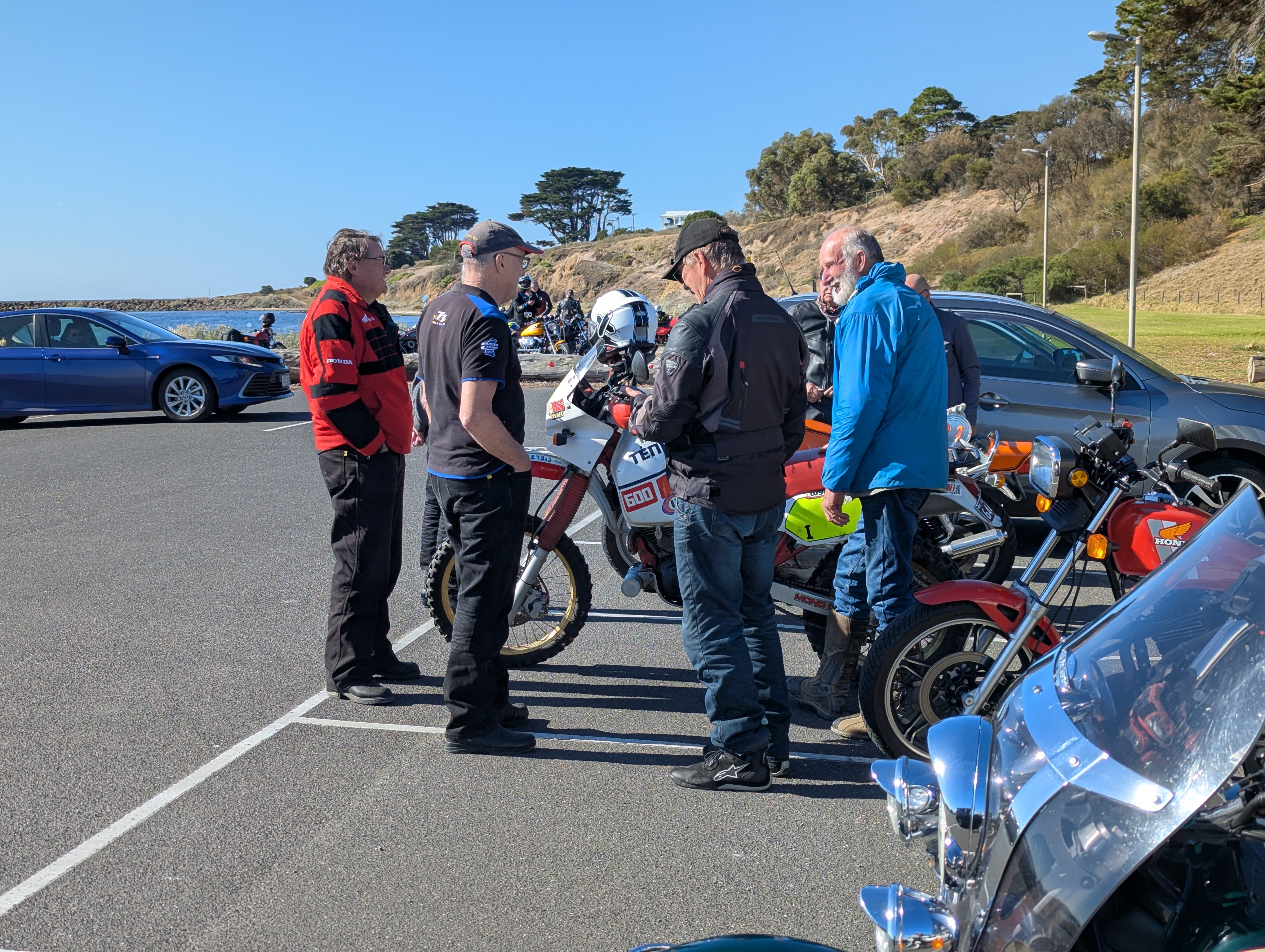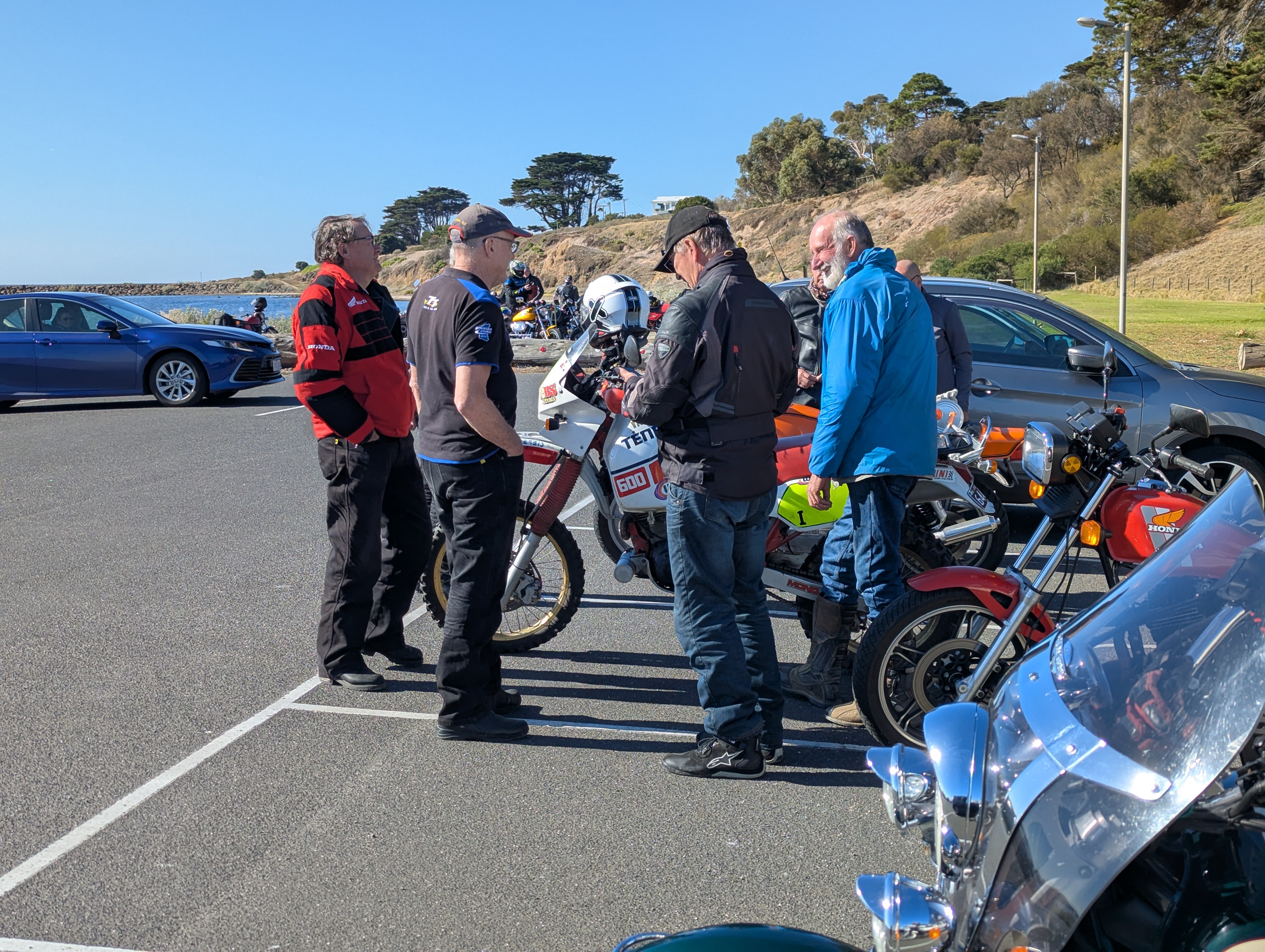 With a few events of note, Ross Bell’s Laverda running on only 2 cylinders requiring Ross to open up the big dellorto carbies to maintain a cruising speed, but a side effect that the hungry Laverda chewed through 15L to do only 80km and leaving Ross out of fuel within site of the Pier St cafe, with assistance from a fellow member Ross was soon arriving at the cafe along with a 5L Jerry Can strapped to the pillion seat.