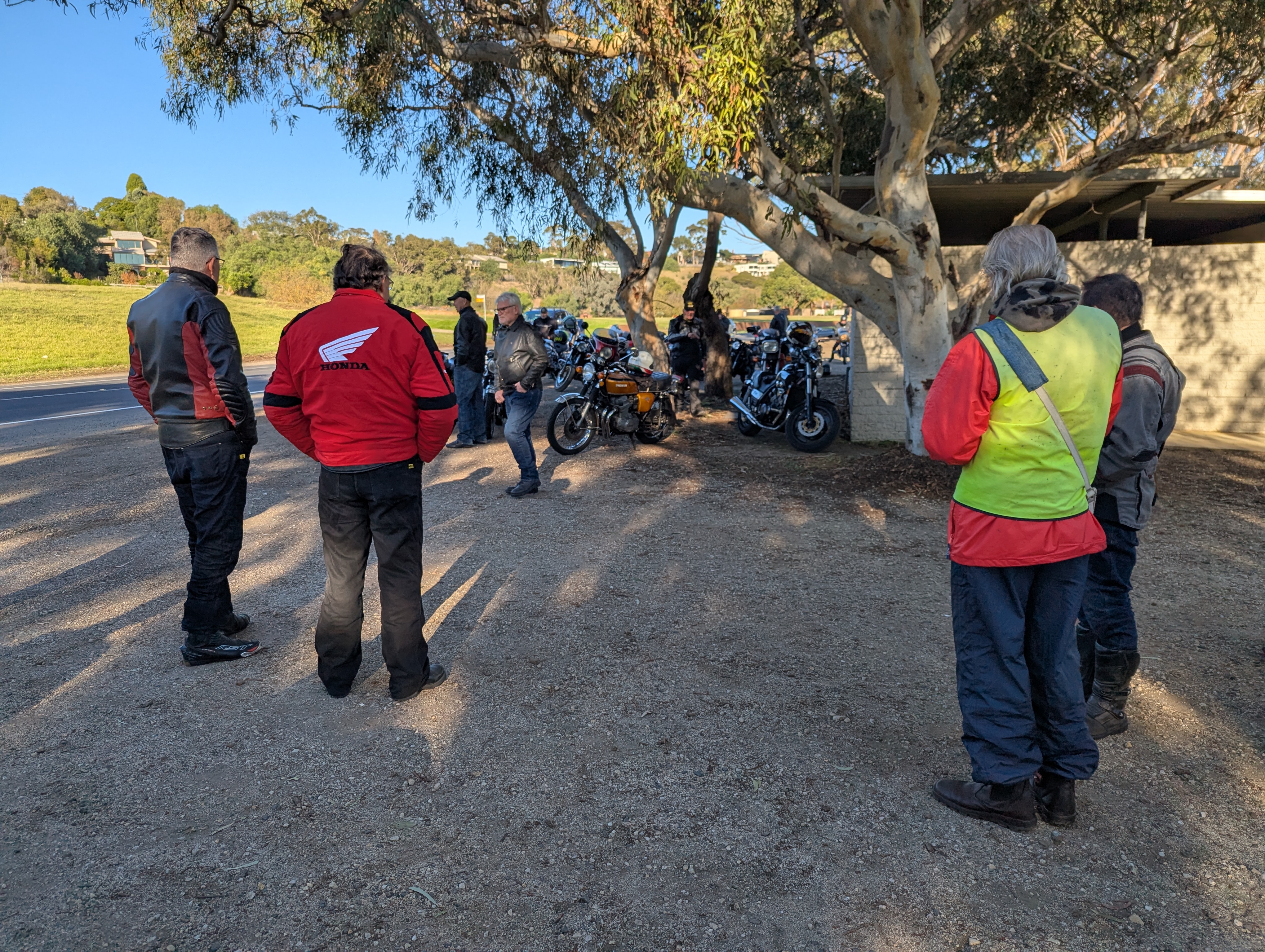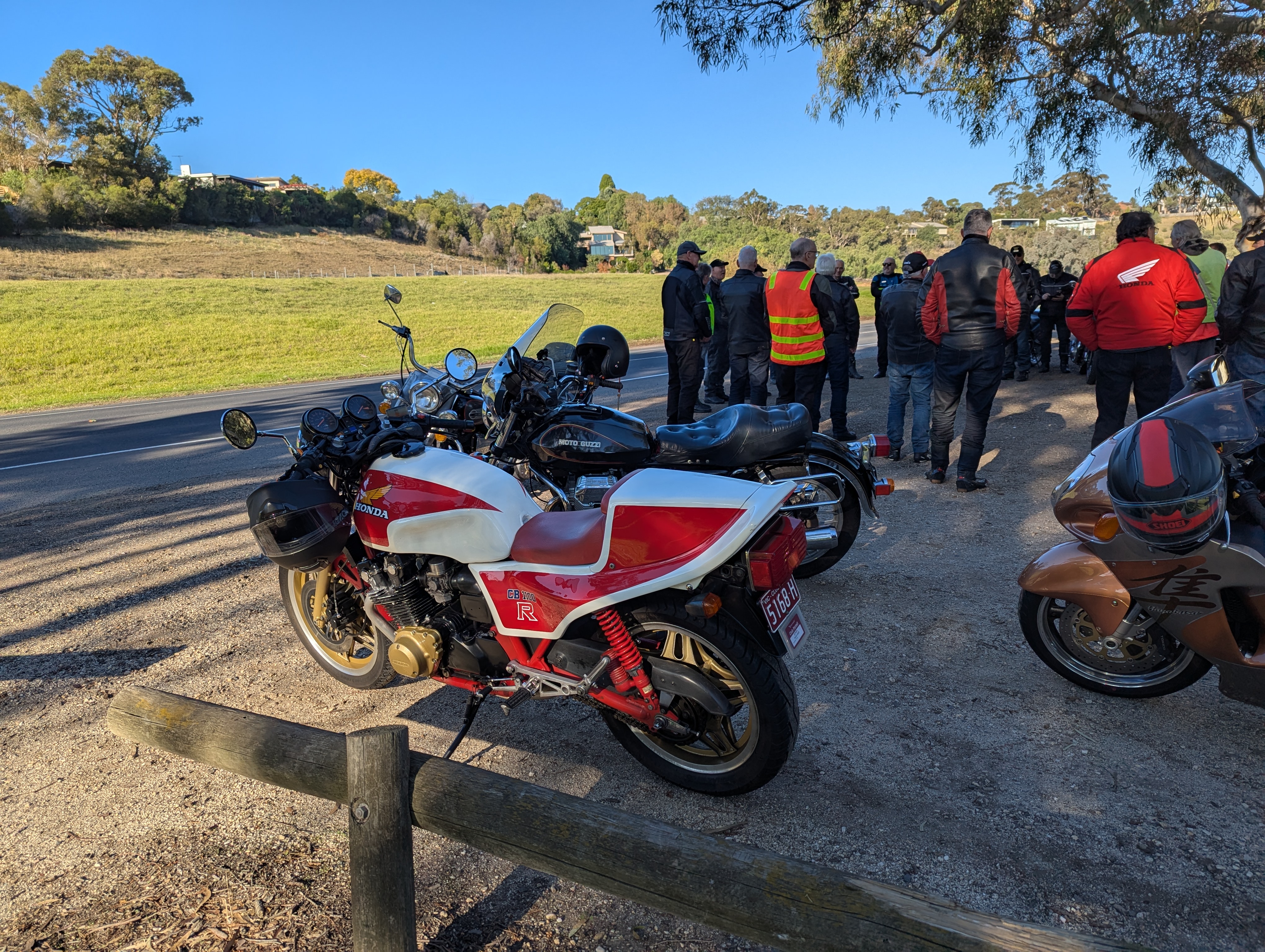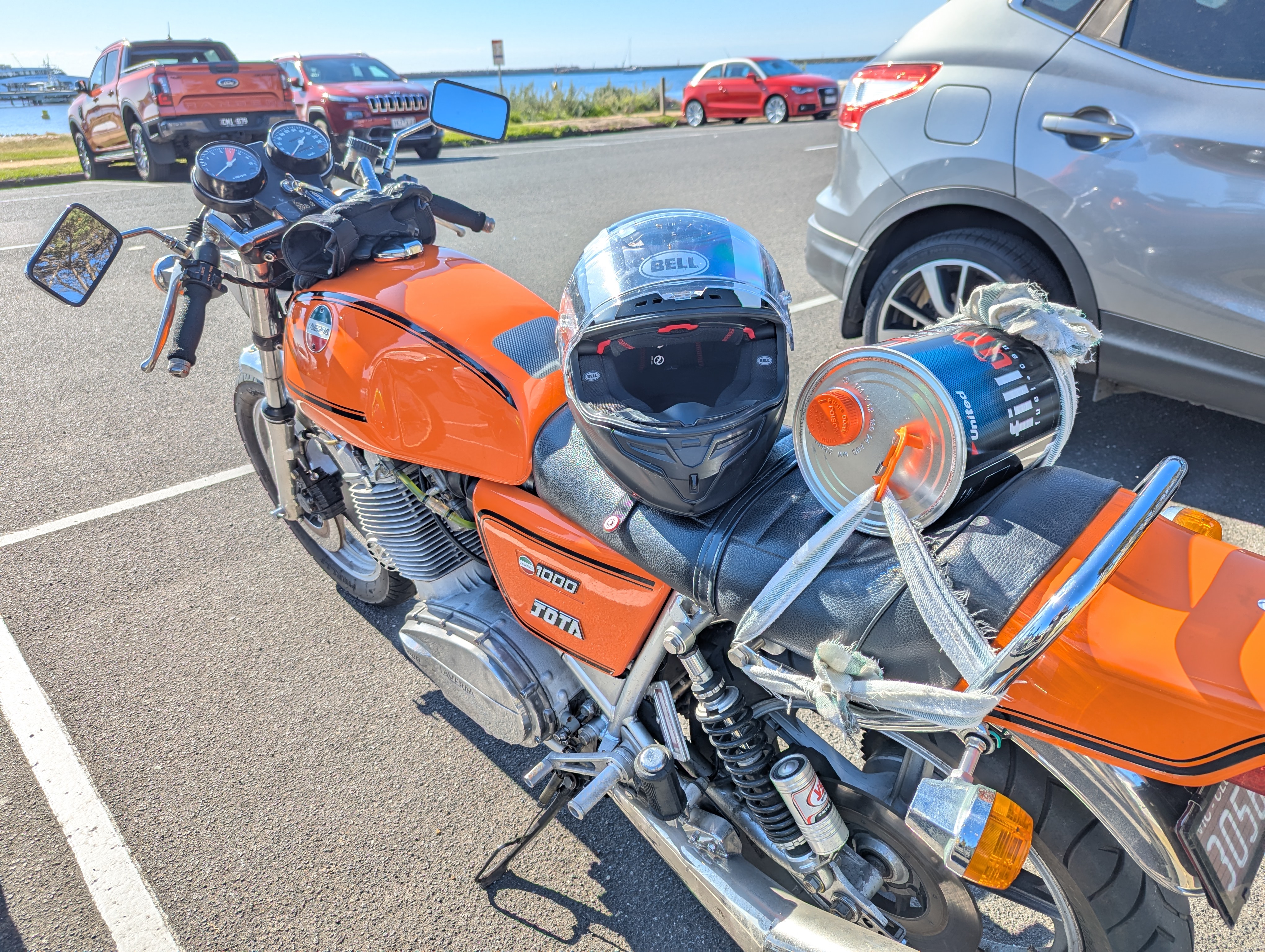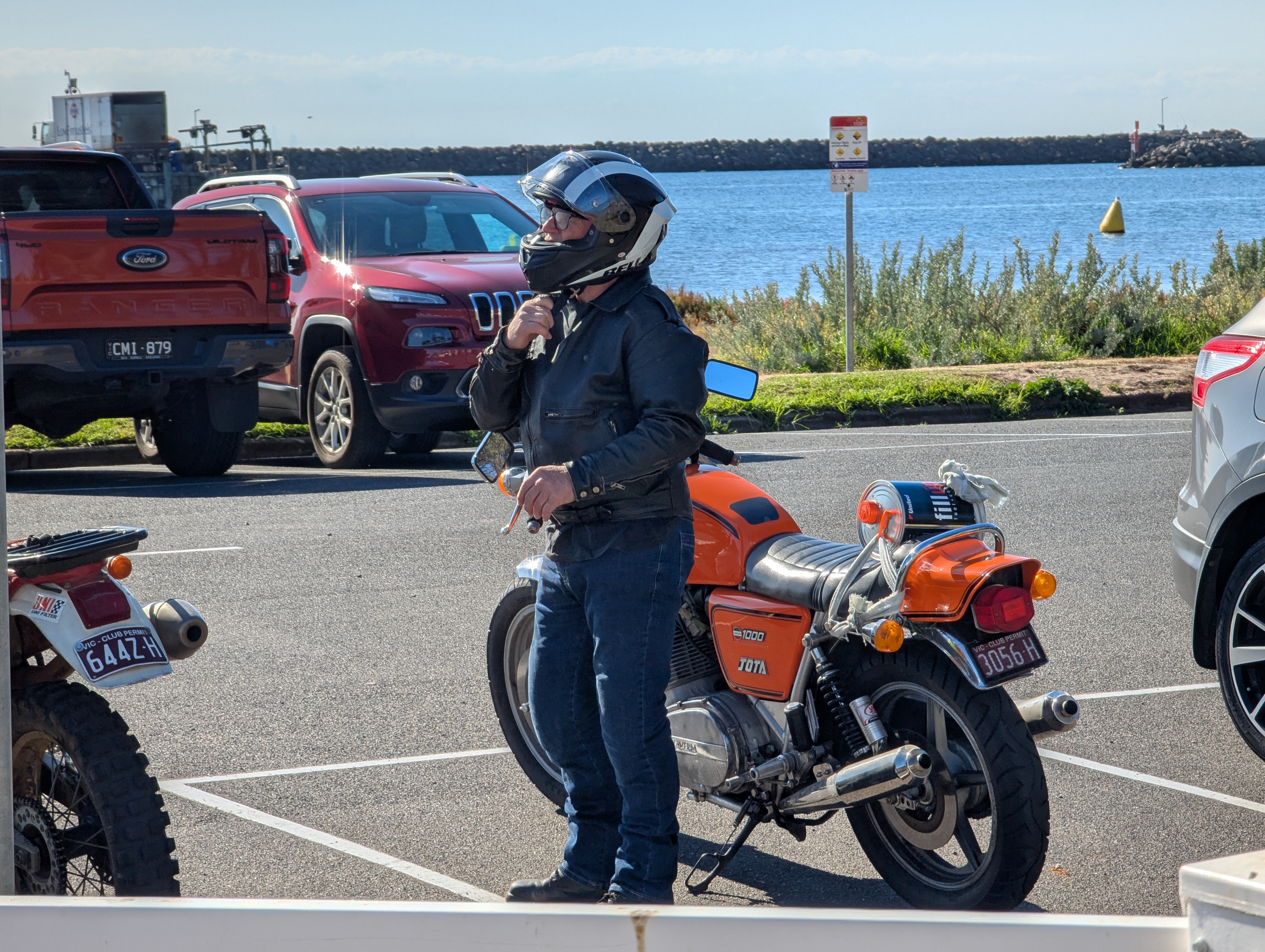 With a few events of note, Ross Bell’s Laverda running on only 2 cylinders requiring Ross to open up the big dellorto carbies to maintain a cruising speed, but a side effect that the hungry Laverda chewed through 15L to do only 80km and leaving Ross out of fuel within site of the Pier St cafe, with assistance from a fellow member Ross was soon arriving at the cafe along with a 5L Jerry Can strapped to the pillion seat.