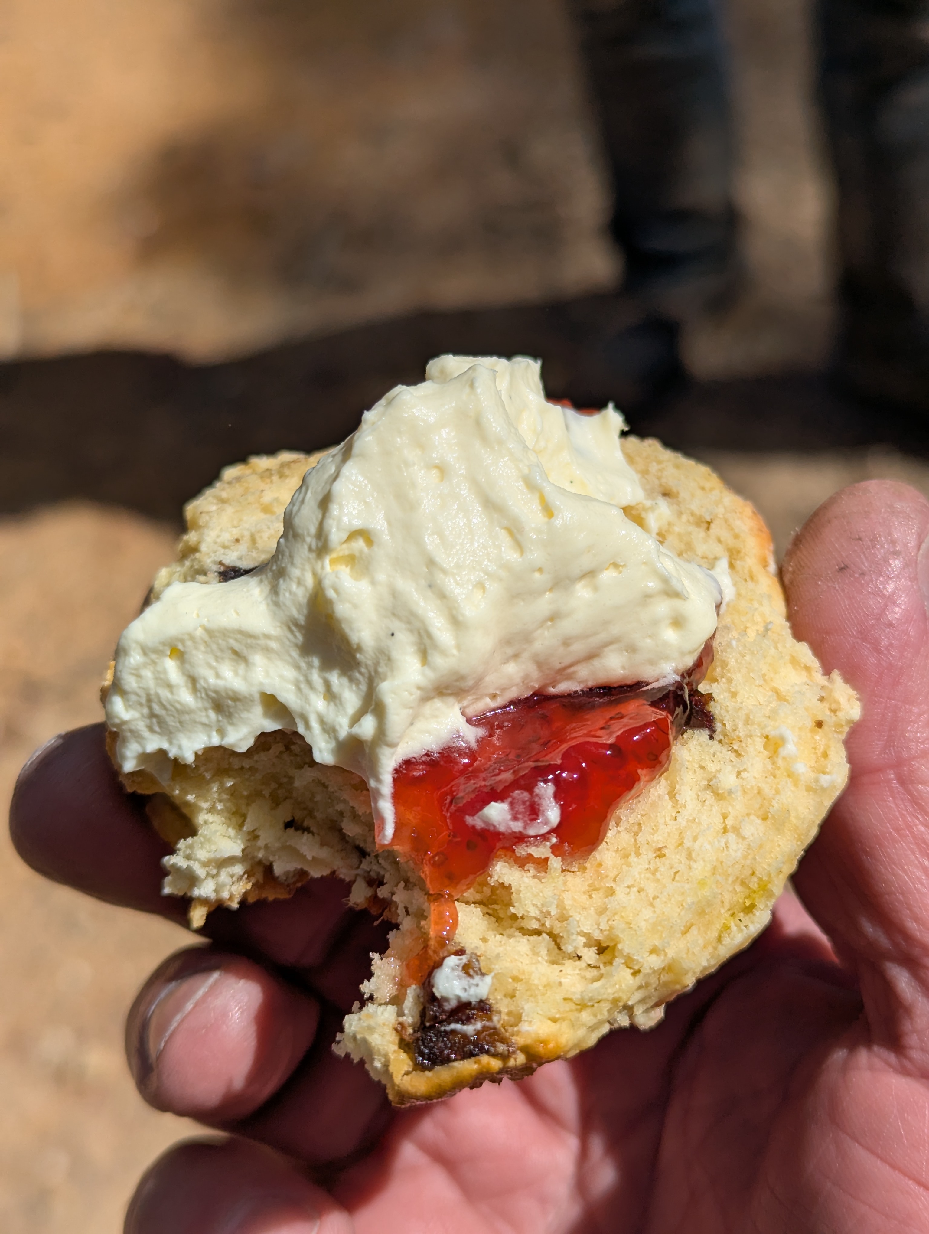 Skirting around the edge of the Corangamite Lake before rejoining the Colac – Ballarat Rd, through Cressy, Rokewood, Corindhap, Dereel, before meeting the Dirt Group just after 12:30pm where Grossy has the BBQ churning out the snags & Wendy’s world famous scones being keenly devoured, and this year Wendy treating everyone to a lavish range of scones including chocolate, dates, just to name a few, all being served with freshly whipped real cream and jam, delicious !..
